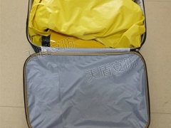 5.折叠时,将头罩开口向上铺于地面.折回头罩、颈扣带及两袖,再将服装纵折,左右重合,两靴尖朝外一侧,将手套放在中部,靴底相对卷成以卷,横向放入重型防护服包装袋内。