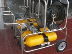 移动供气源组成部分,导气长管卷筒及携带箱、气源分配器、减压器、高压压力表、中压表、压力报警器、供气阀、全面罩及腰带。